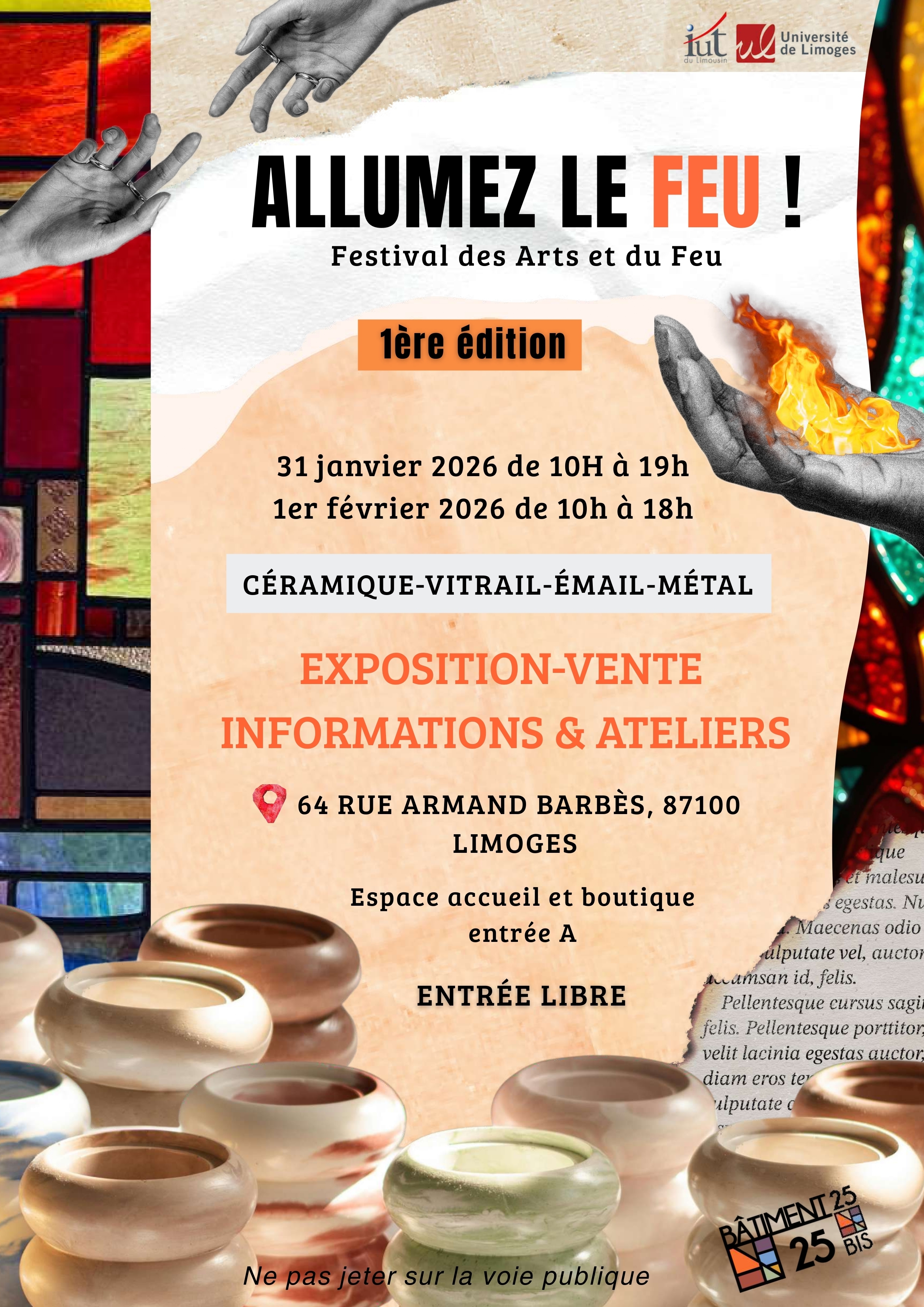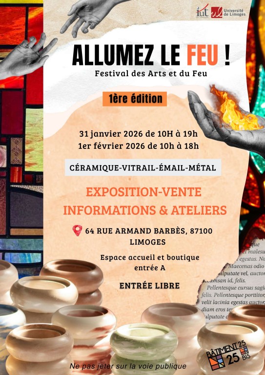 Immersion dans les arts du feu au travers d'une expostion-vente, de visite d'atelier, stages de découverte et de stands d'information des formations professionnelles locales.